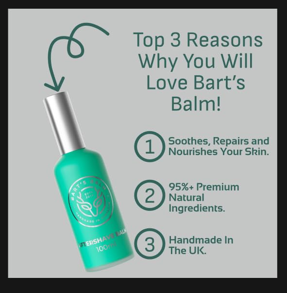 WHY BART’S BALM? – Beautifully presented in a 100ml frosted glass bottle and accompanying protective tube, if you suffer from razor burn, razor rash or any irritation after shaving then our Ben Macdui Argan Oil Aftershave Balm for men is the product for you. Handmade In Scotland, suitable for even the most sensitive of skin, our Argan Oil post shave balm has been specifically formulated to help repair, soothe and calm your skin, after shaving helping alleviate any ingrown hair or razor bumps.